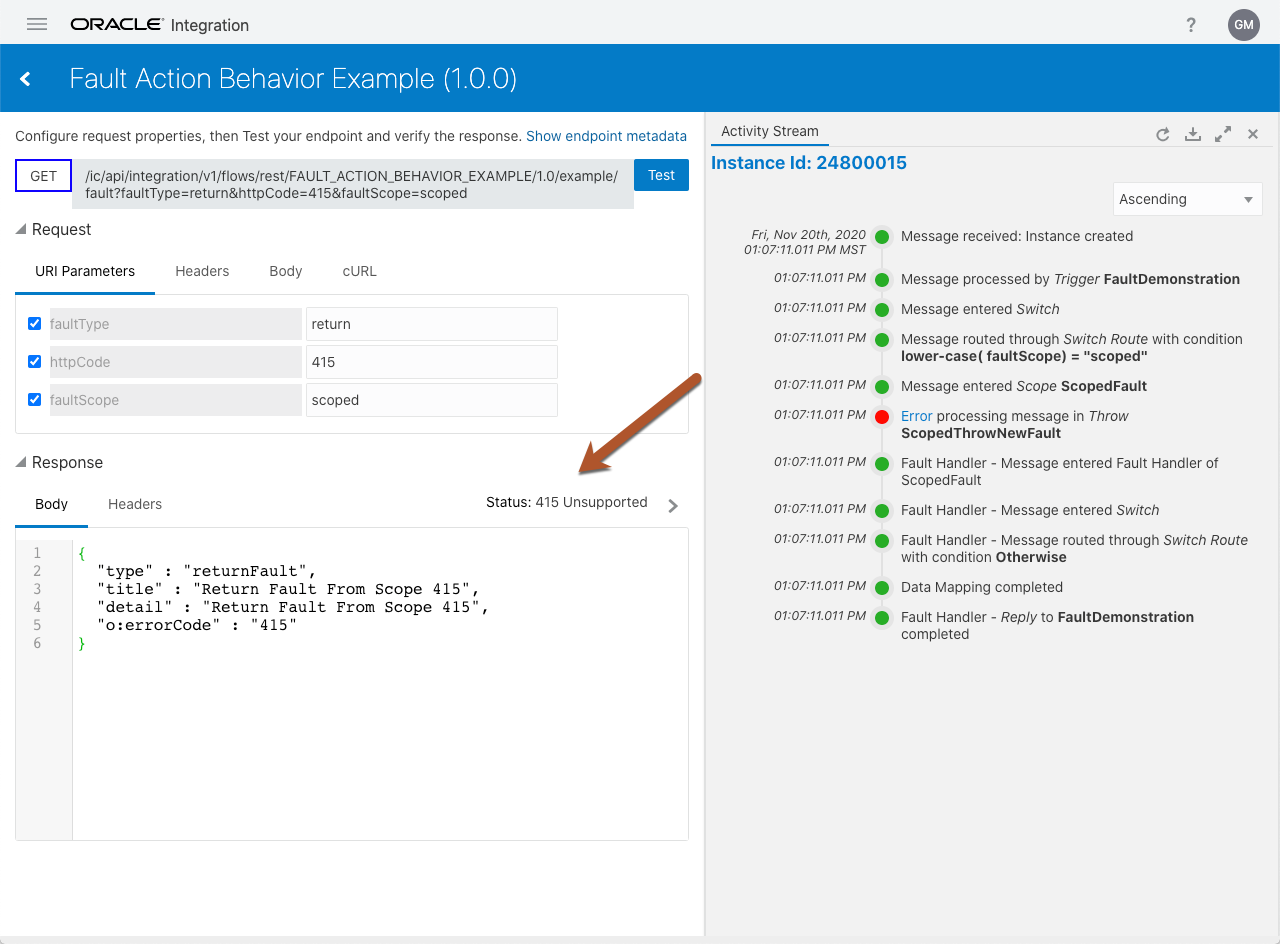 We can see that whenever a fault is “thrown” (throw-new or rethrow), IC will surface the fault as a 500 Internal Server Error with the real fault in the “o:errorDetails”. The biggest complaint with this behavior is the actual errorCode is buried in the “o:errorDetails”.  Adding to the challenge, what if the business use case requires that the actual HTTP status code be surfaced vs. a generic 500 status code?  Based on our test cases, we have an option with the Return Fault Action as the correct HTTP status code is returned along with the fault details.  However, this has a not so obvious impact on the integration instance Status: