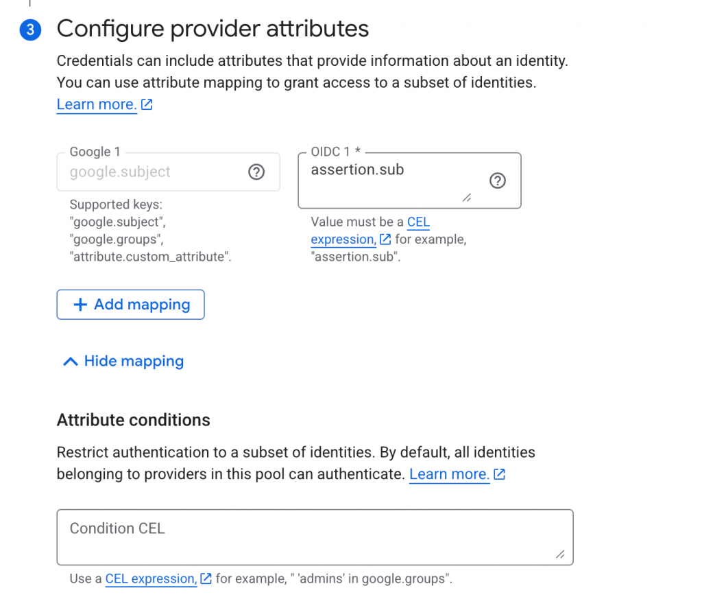 - Map incoming token to GCP token based on an attribute in the claim. You can also add claim attribute conditions. Learn more about those conditions from https://docs.cloud.google.com/iam/docs/workload-identity-federation?_gl=1*1l7jwn3*_ga*MTQxNTQzOTY3My4xNzcwMzYxNzU0*_ga_WH2QY8WWF5*czE3NzAzOTk2NDQkbzIkZzEkdDE3NzAzOTk2NTYkajQ4JGwwJGgw#conditions