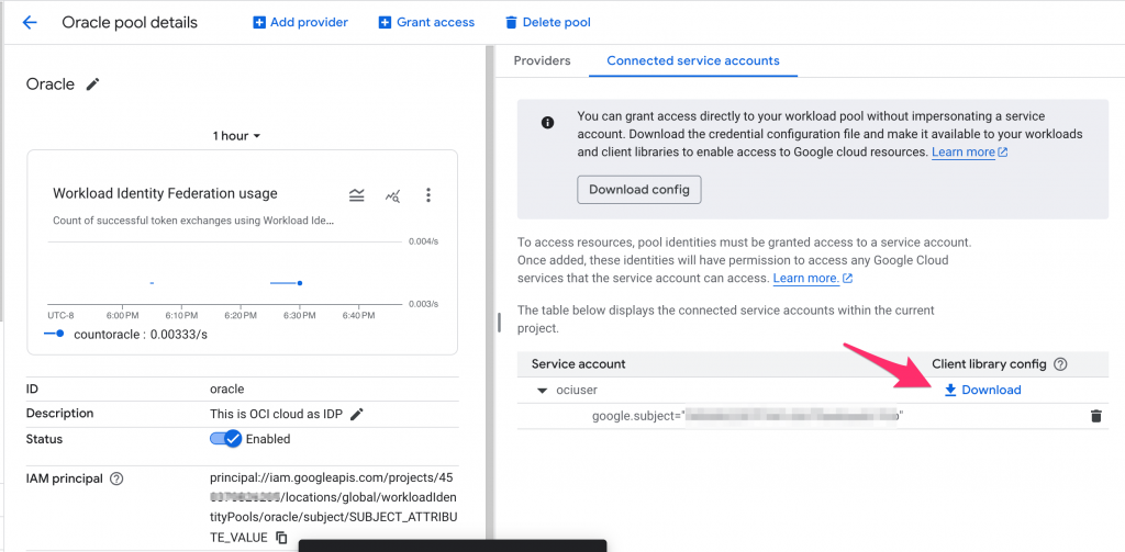 Once the trust is configured, you can use the file you downloaded in the last step with the Google SDK. At runtime, you first need to exchange an OCI Instance Principal Session Token or a Resource Principal Session Token for an OCI IAM token (OIDC token).