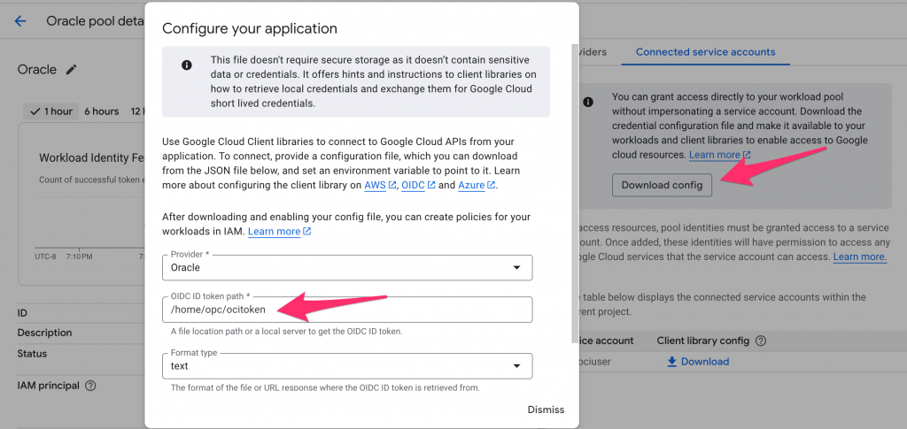 There is another approach that does not use the credentials object or OCITokenSupplier. You generate an OCI token and write it to one of the files. You have to specify the location of the Google Cloud credentials file when downloading it, as shown in the screenshot below. Save the credentials file on the file system along with the OCI token and use it to connect to Google Cloud.