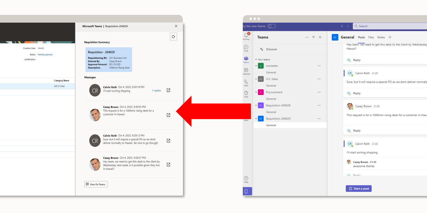 • Any changes to business objects in Oracle Fusion will result in a message being posted , and the associated header message, in the Microsoft Teams conversation