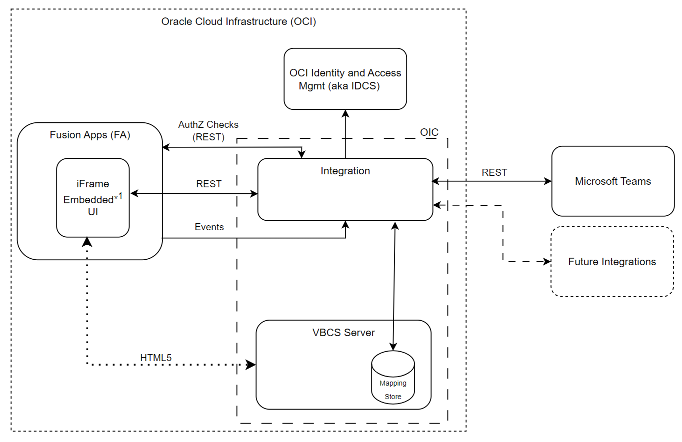 The API used between VBCS and OIC is generic and not specific to Microsoft Teams as the backend. In the future it would be possible to switch out Microsoft Teams and implement an integration layer for Slack, Zoom etc for very little, if any, changes to the UI.