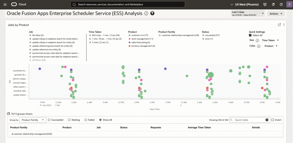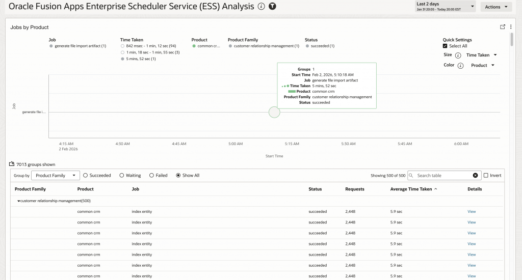 - Cross-Module Impact Assessment: When investigating job failures or performance issues, administrators can quickly see which Fusion modules are affected and correlate issues across different application areas. This unified view is essential for understanding the broader impact of ESS job problems.