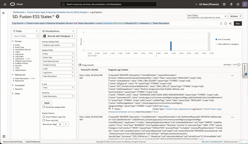 After setting up Fusion Applications audit logs ingestion in OCI Log Analytics (Parts 1 and 2), organizations need to transform raw log data into actionable insights. This blog post demonstrates how to leverage OCI Log Analytics dashboards and LoganAI to gain comprehensive visibility into Fusion Applications ESS jobs, security events, and audit activities. We’ll explore dashboard visualizations, compare Fusion native interfaces with OCI Log Analytics capabilities, and showcase AI-powered analysis for proactive monitoring and threat detection.