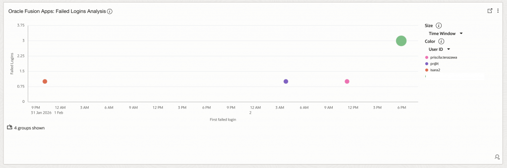 - Fusion Apps: Failed Login Top Users: This widget identifies users with the highest number of failed login attempts, helping prioritize investigation of potentially compromised accounts or brute-force attack targets.