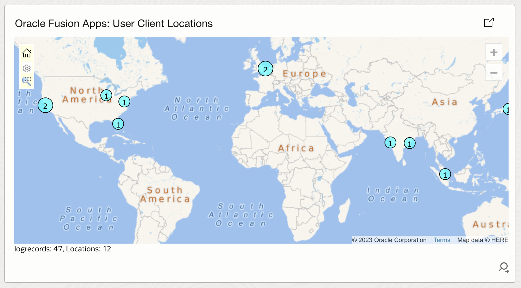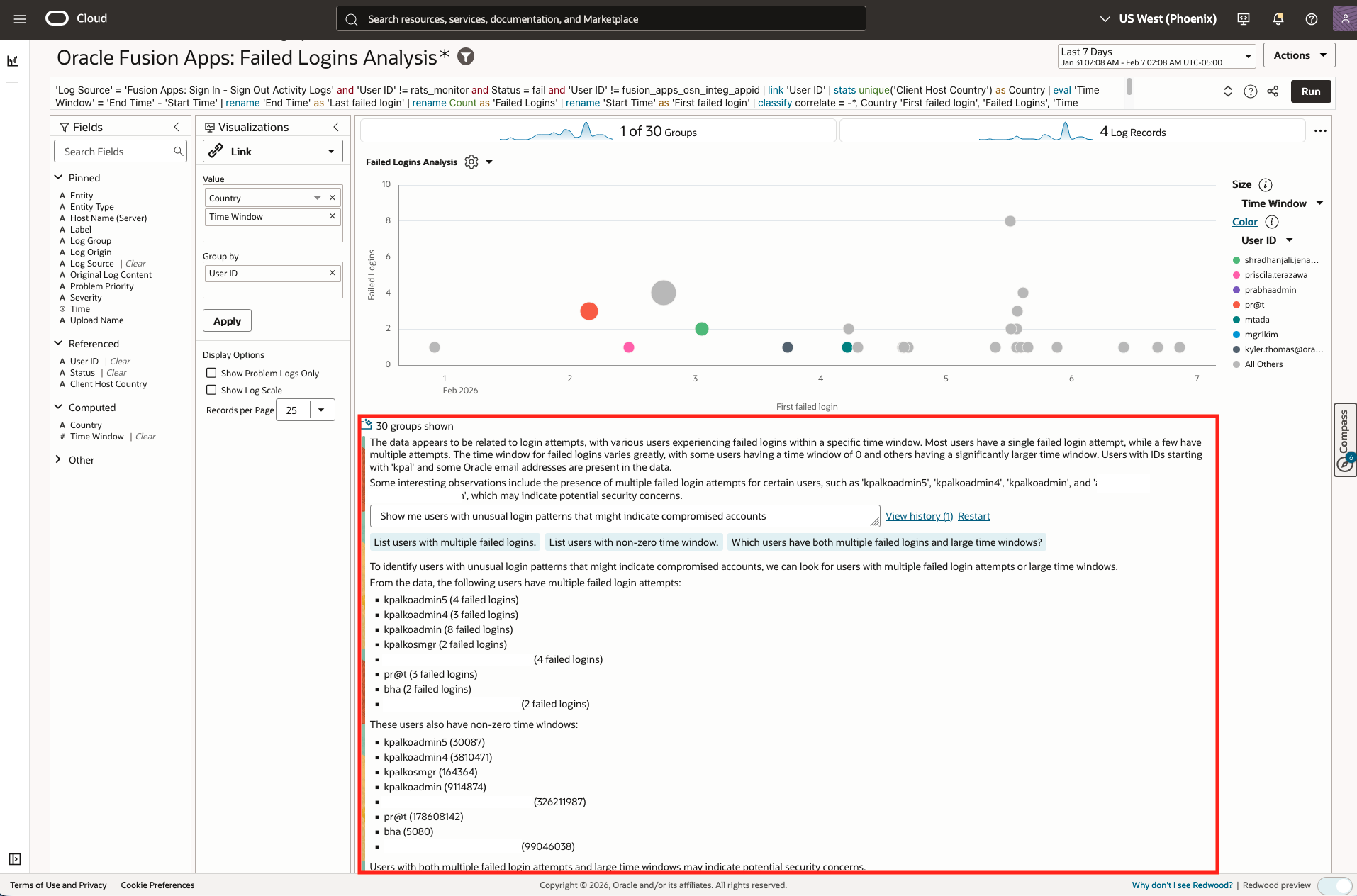 - Fusion Apps: Failed Login multi-dimensional Analysis: This widget provides a multi-dimensional view of failed logins by country and city, enabling correlation analysis to identify coordinated attacks across geographic regions.