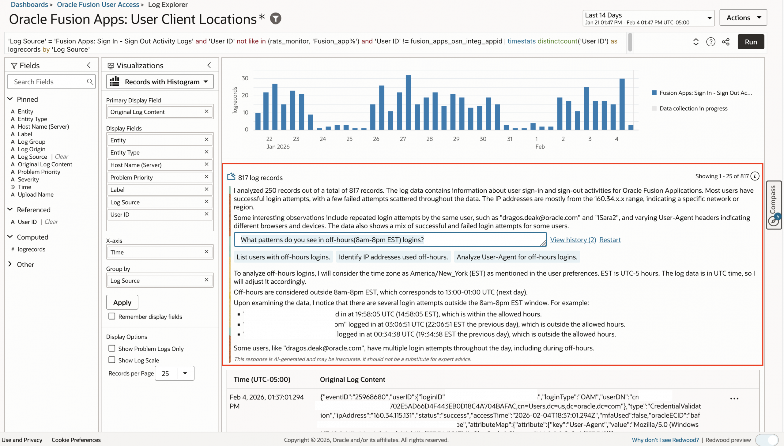 With the introduction of the GenAI-powered LoganAI feature in Log Analytics, this process is dramatically enhanced. Now, administrators and security teams can simply ask their questions in plain language—LoganAI automatically leverages the underlying log data as context for the large language model (LLM). This means you can get clear, actionable answers to complex operational and security queries in real time, without manually writing queries or manually preparing the data. By leveraging LoganAI’s GenAI capabilities, you move from static metrics to dynamic, AI-driven observability—enabling faster, deeper insights into both ESS job processing and Fusion user access, all by simply providing your logs as context to the LLM.