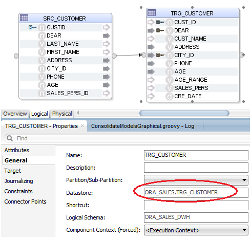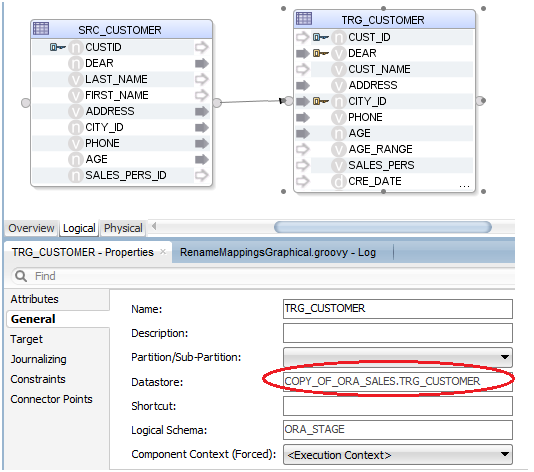 An example of the result of running this script is illustrated in the screenshots below. The first screenshot shows that, in the original mapping, the target table comes from the model COPY_OF_ORA_SALES