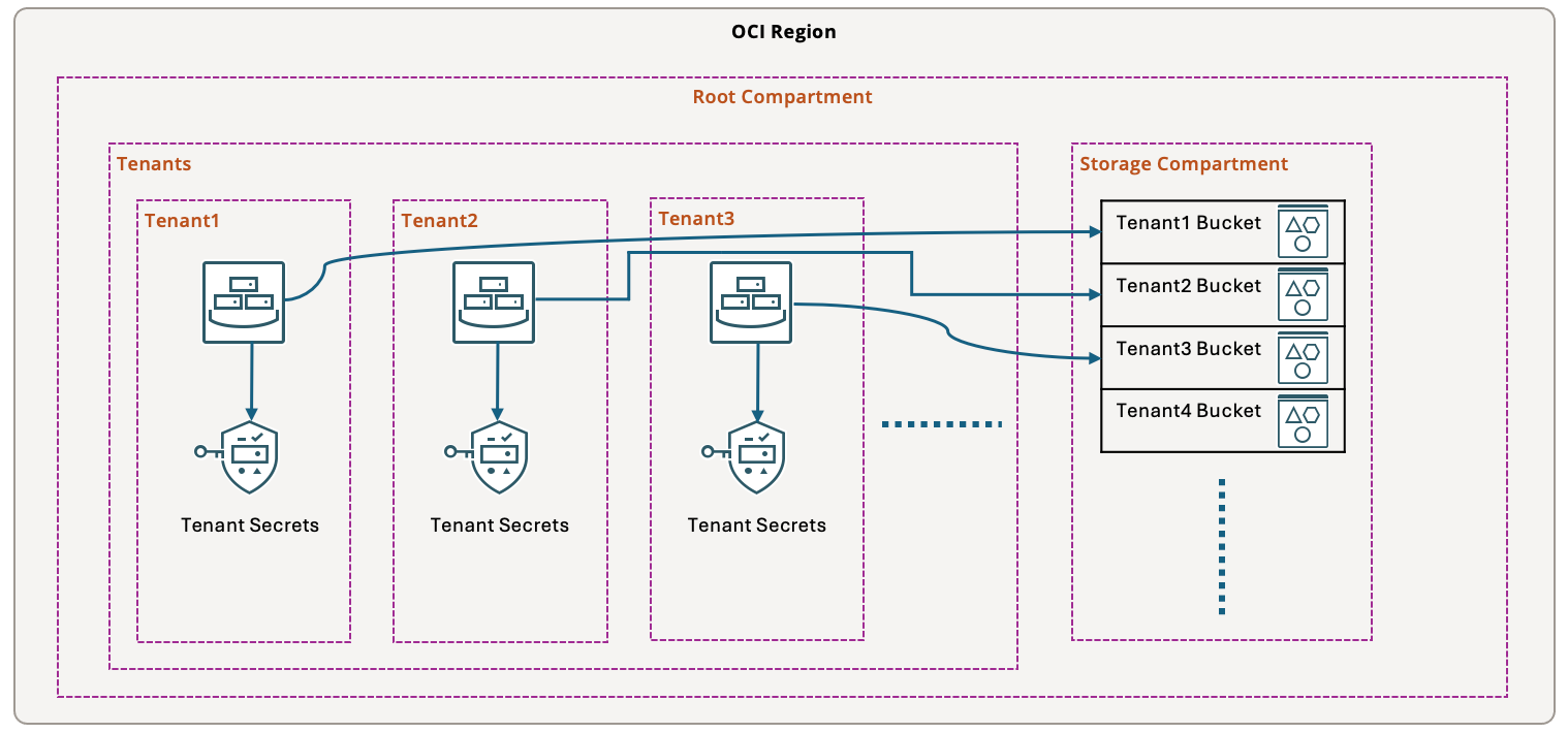 - All instances for a specific tenant/customer can read buckets for that specific tenant/customer in shared storage compartment.