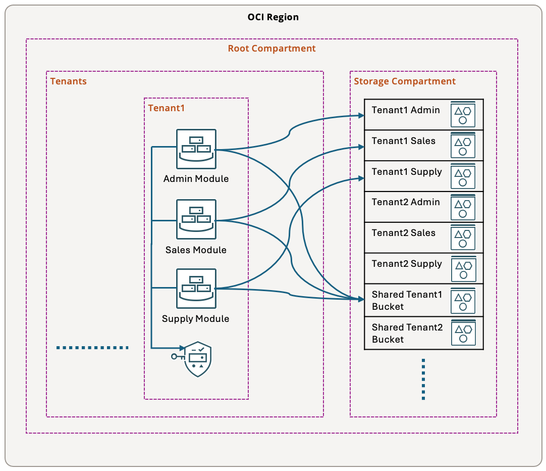 - All instances of Sales service for a specific tenant can read Sales buckets for that specific tenant in shared storage compartment.