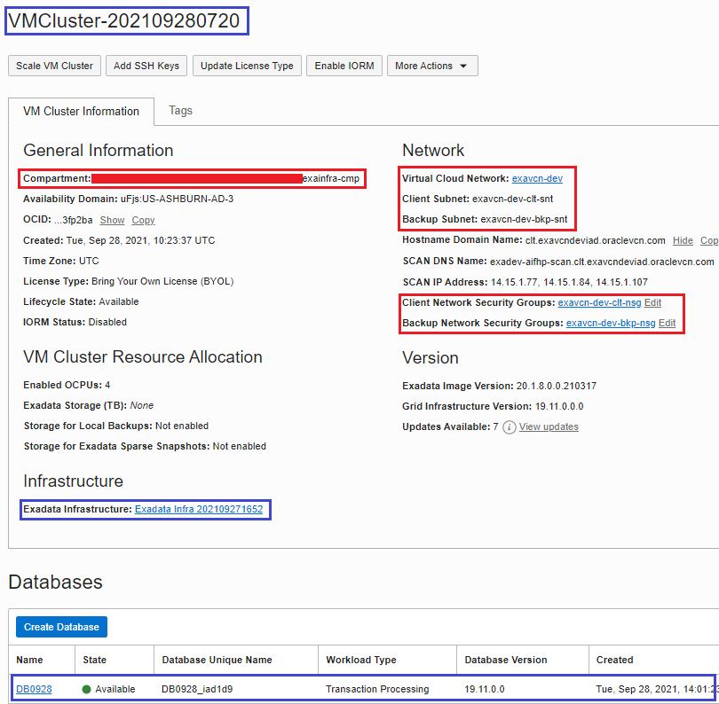 With the basic networking and IAM configuration in place, the next step is provisioning the ExaCS infrastructure, VM cluster and database system (these are not provisioned by Landing Zone).
