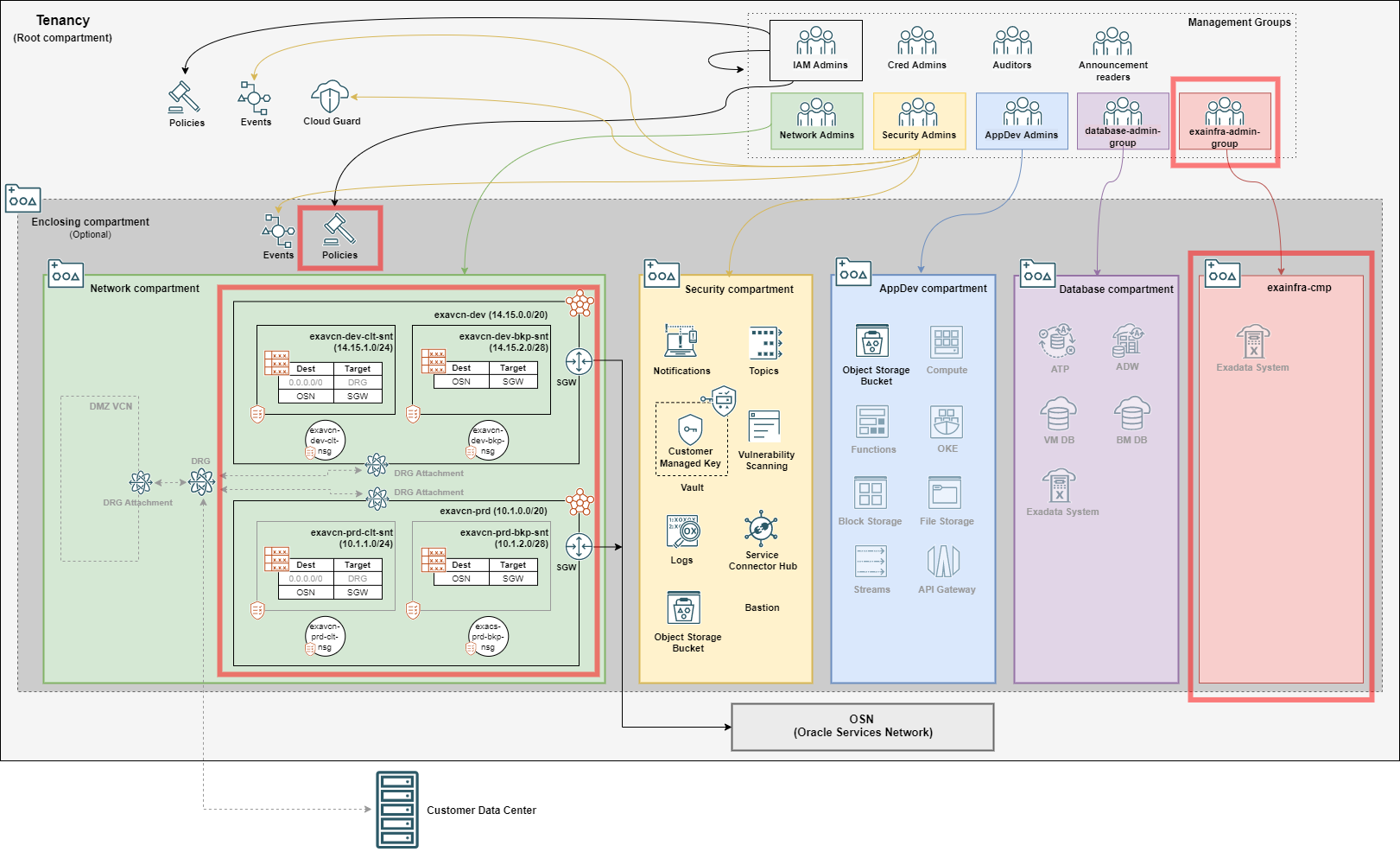 The Landing Zone creates one or more VCNs configured for ExaCS, in accordance with the network requirements described in https://docs.oracle.com/en-us/iaas/Content/Database/Tasks/exanetwork.htm. It can also create a compartment for the ExaCS infrastructure, in which case an admin group for ExaCS is provisioned. Optionally, customers can choose not to create this compartment, making ExaCS managed by the Database admin group.