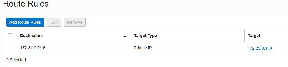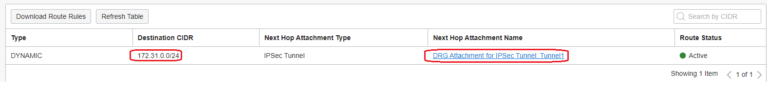 4. The Route Table for the HUB VCN attachment needs to have a route to 172.31.0.0/16 destination with the IPSec tunnel attachment as a next-hop: