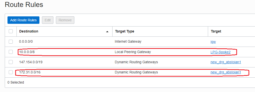 3. The route table associated with the subnet where the NAT VM VNIC is located, needs to send the traffic to the DRG as a next-hop for 172.31.0.0/16 destination and to the HUB-LPG for 10.0.1.0/24 destination: