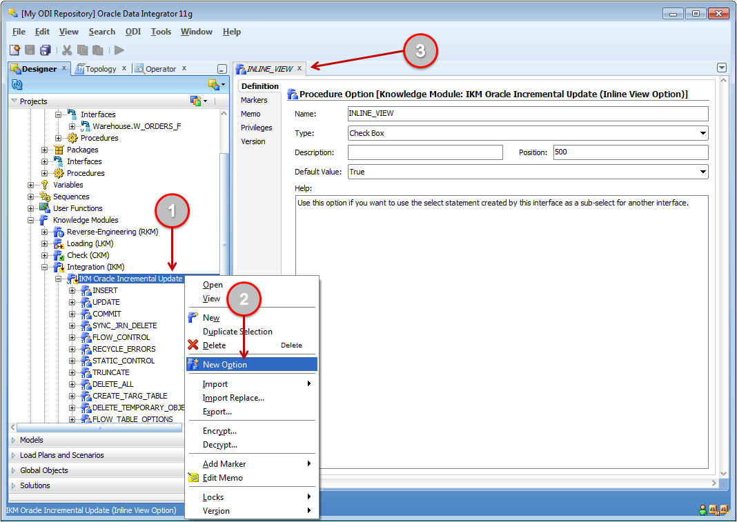 Create a new option in the KM called “INLINE_VIEW” of type “Check Box” with a default value of “True” as illustrated on Figure 18.