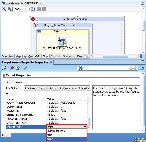 Close and open the Orders fact interface again (Warehouse.W_ORDERS_F). Go to the Flow tab of the interface, and select the new INLINE_VIEW option, and set it to “false” as shown Figure 21:
