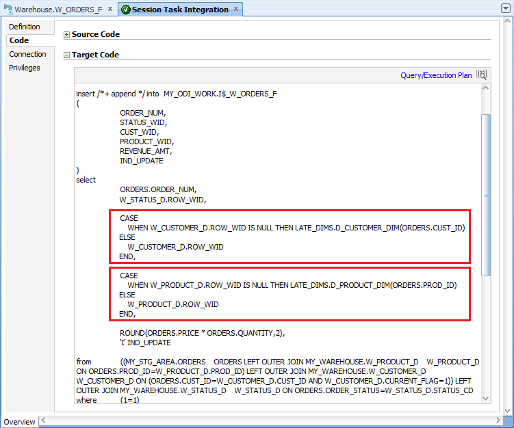Our mappings are now complete. Let’s run the Early Arriving fact interface and verify how ODI evaluates the ODI user functions. Figure 17 shows an example of how the “Insert flow into I$ table” step (from the IKM Oracle Incremental Update) looks like when running the Orders Fact interface. You can see how ODI substitutes the user functions (LATE_CUSTOMER, and LATE_PRODUCT) with the actual code: the CASE statements: