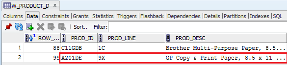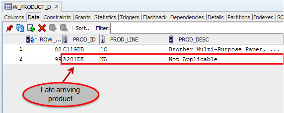 c. The MY_WAREHOUSE.W_PRODUCT_D table should have a new record: the late arriving product (product #A201DE):