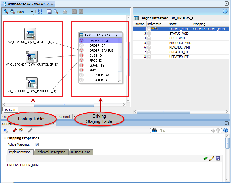 Figure 8 shows how the lookup tables and the driving table have been modeled in the Orders Fact interface (Warehouse.W_ORDERS_F):