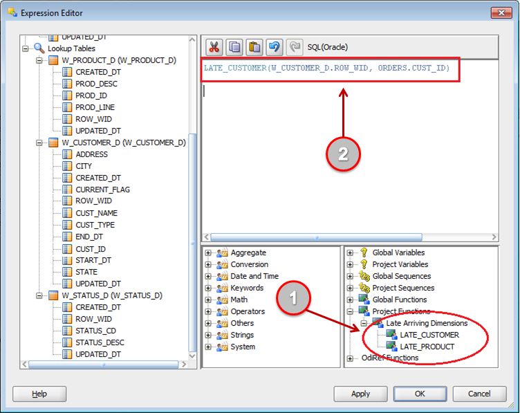 - In our Order Fact interface, columns CUST_WID, and STATUS_WID have been mapped to ODI user functions LATE_CUSTOMER, and LATE_PRODUCT respectively. These ODI user functions will invoke the PL/SQL package called “LATE_DIMS”. This package will execute an INSERT DML operation when a warehouse key is not found in the Customer or Product dimension.