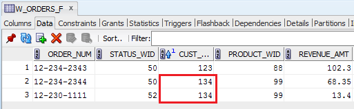 7. Finally, run again the “Warehouse.W_ORDERS_F” interface, and verify that for customer #1234, the customer warehouse ID (CUST_WID) in the fact table has been updated with the latest warehouse ID. In my example the latest customer warehouse ID is 134: