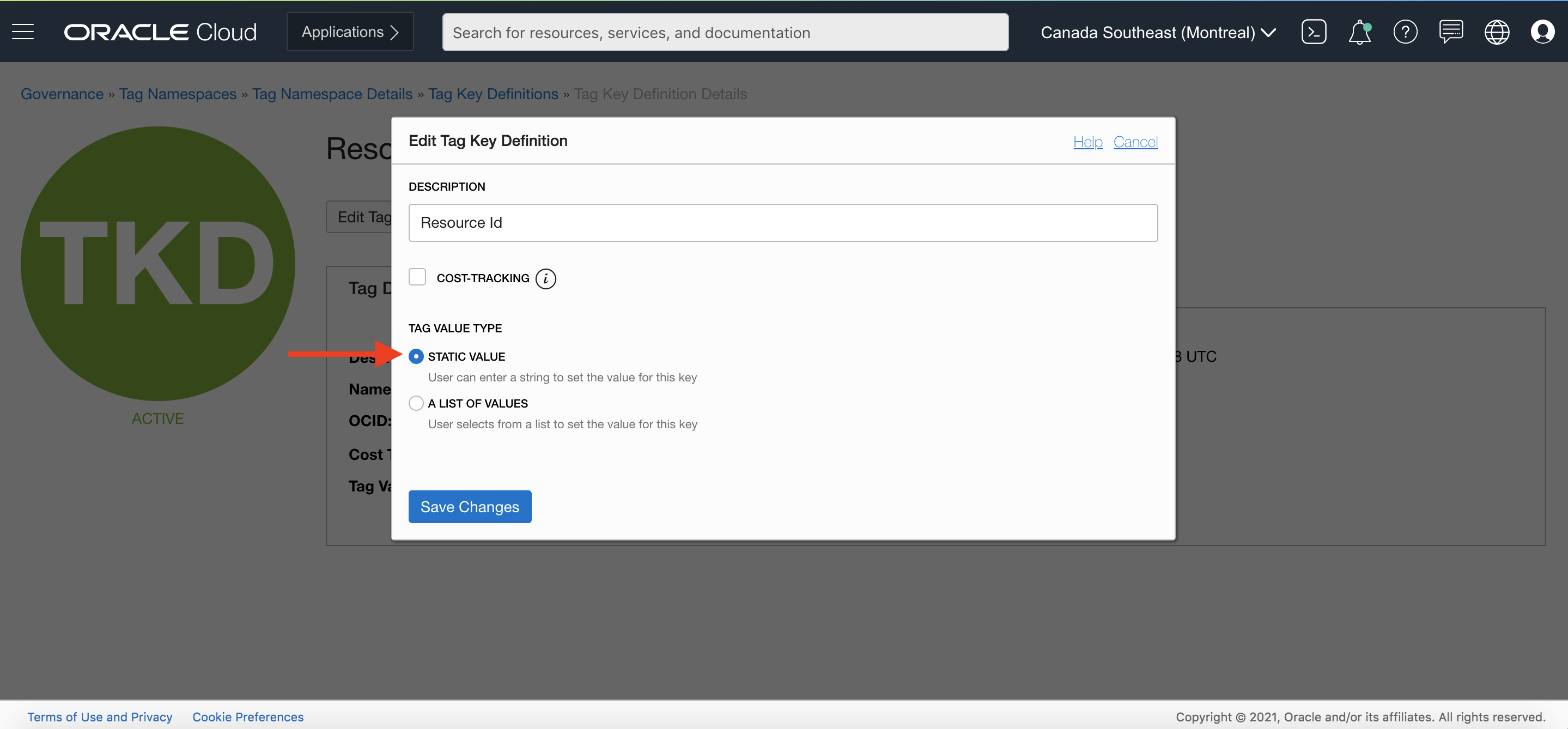 Next, add the SiteCode tag to the Region compartment, selecting the appropriate region specific value for the tag. For example, for the “Region Compartment – Ashburn” compartment in Fig 1 above, select the tag value of us-oci-ash. This is shown below –