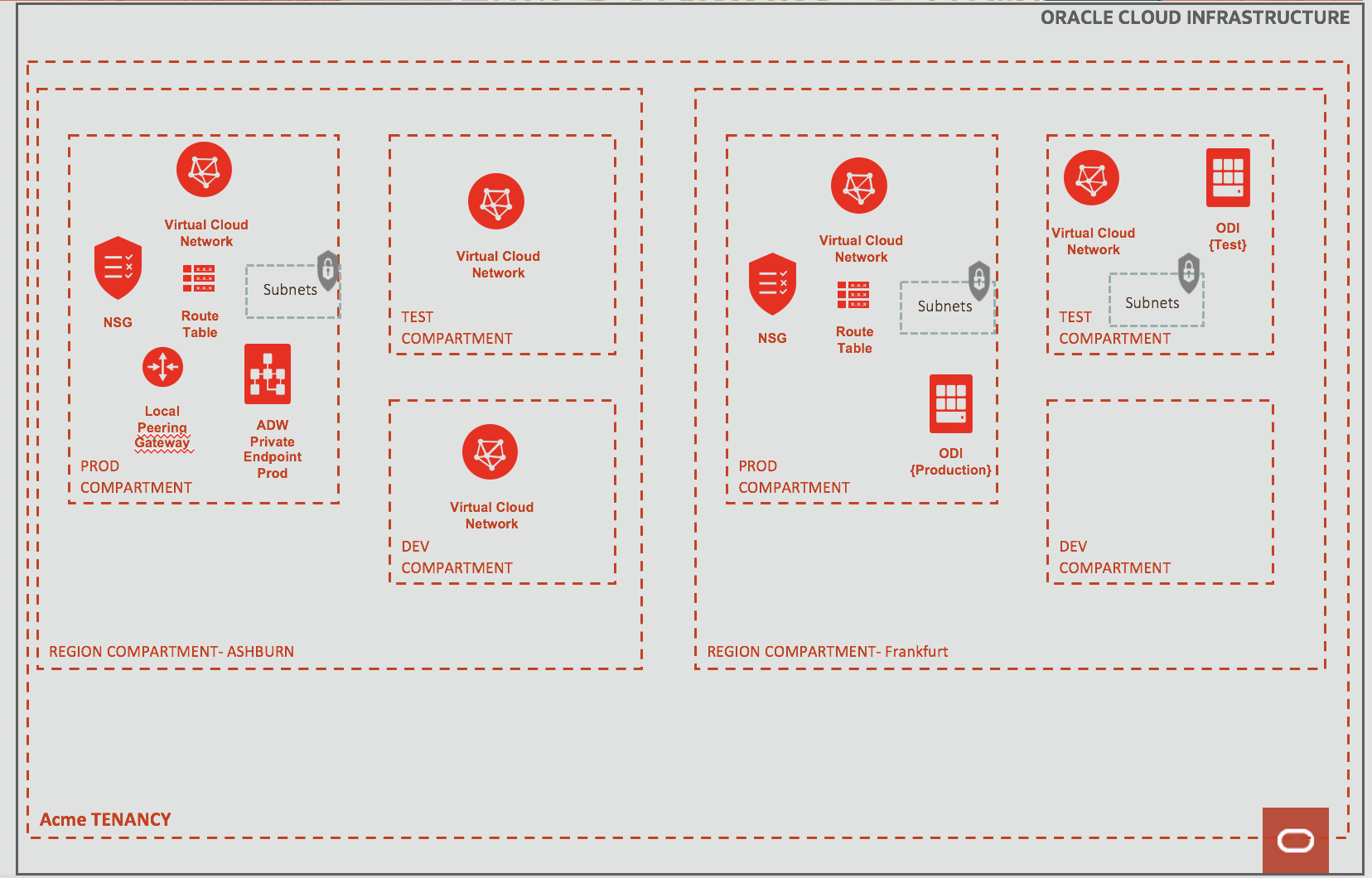 In the above tenancy, the company (Acme) has subscribed to two OCI regions – Ashburn in US and Frankfurt, Germany. Acme has also decided to organize its regional resources in separate compartments for better handle on governance (cost, etc.). Thus all Ashburn and Frankfurt resources are grouped in their respective compartments.