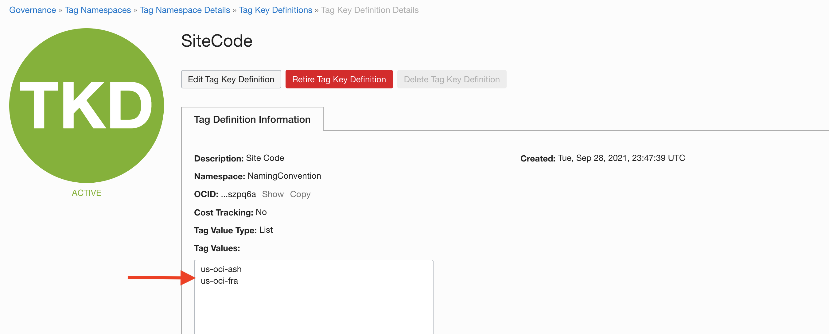 SiteCode: a predefined tag with list of the subscribed OCI regions, here Ash and Fra –