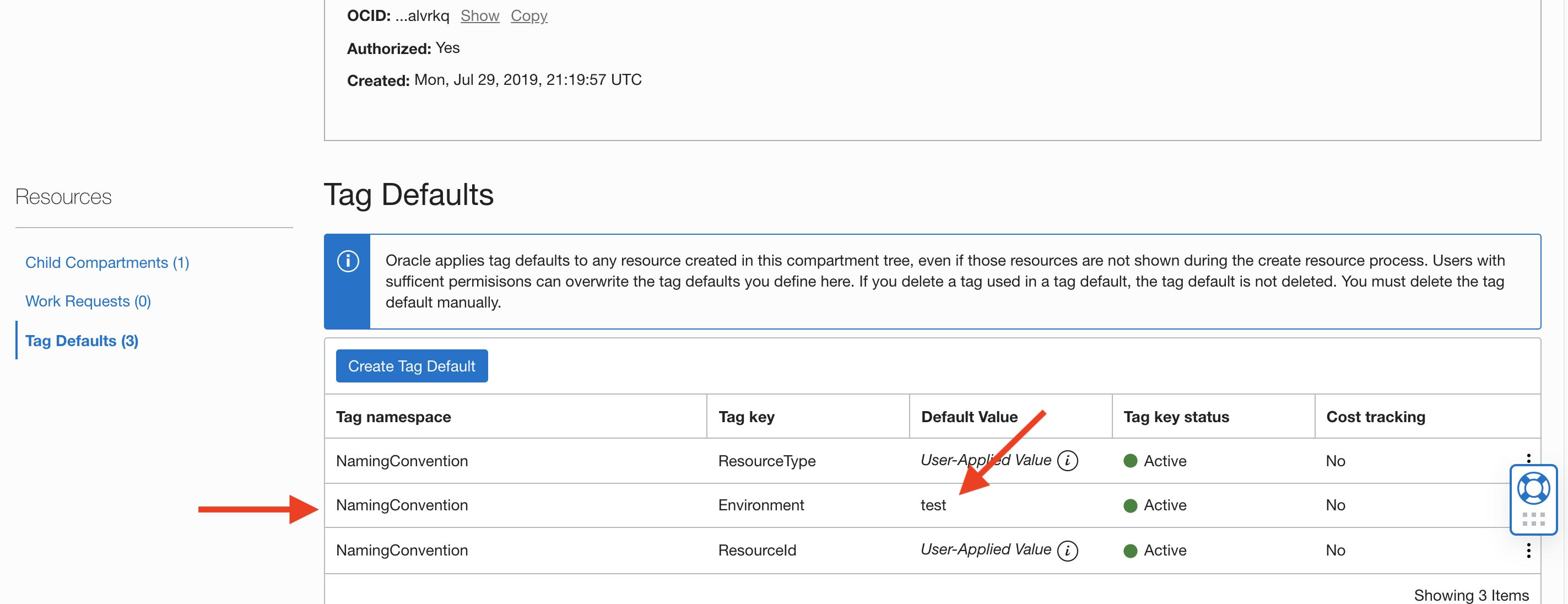 A consequence of defining the tag defaults will be that all subsequent resources created in the compartment tree will be required to have these 4 keys: 2 keys – SiteCode, Environment – will be automatically applied the default values while the user has to supply values for ResourceType and ResourceId. This holds true even with child compartments, e.g. –