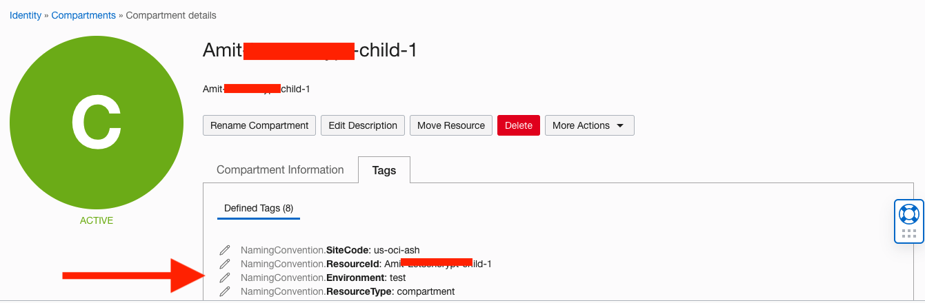An implication of adding the above tag default to the Region compartment is that this tag will cascade or inherited down the compartment hierarchy and will be applied to all resources in the compartment tree. Next add rest of the tags – Environment, ResourceType and ResourceId – to the environment specific compartments. For example, the Test compartment (which is a child compartment of Region) will have the following tags defined –