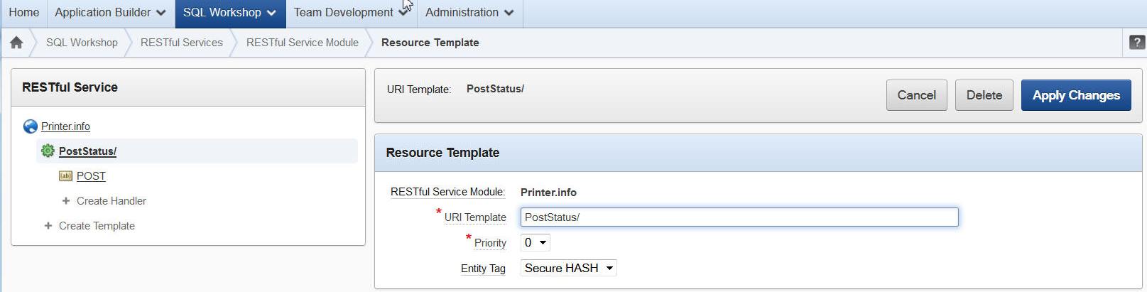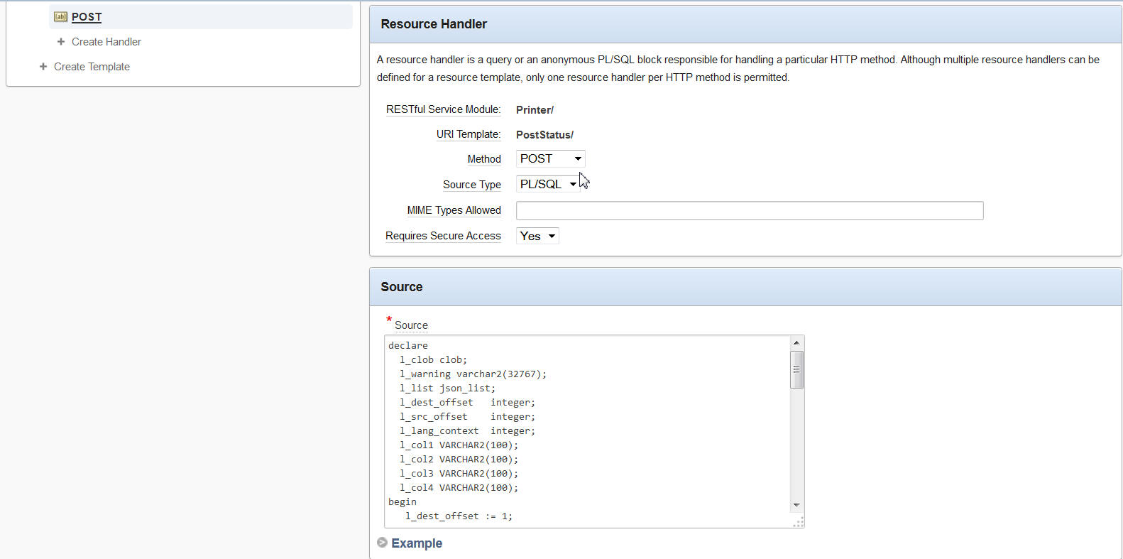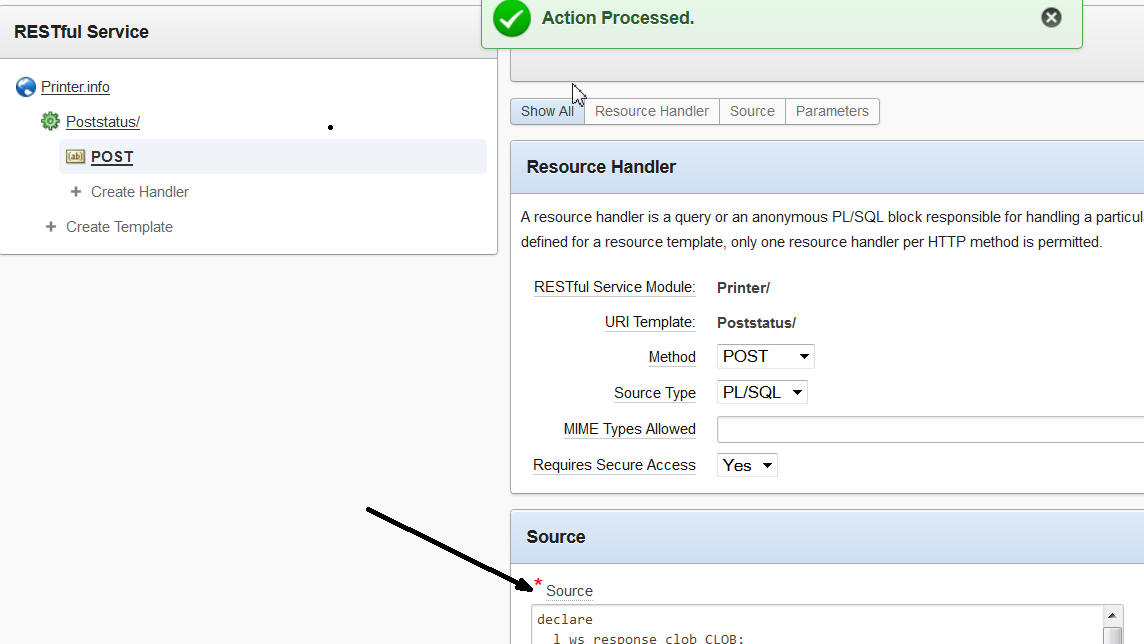 SQL Developer -> RESTful Services -> Module -> URI Template -> POST SOURCE