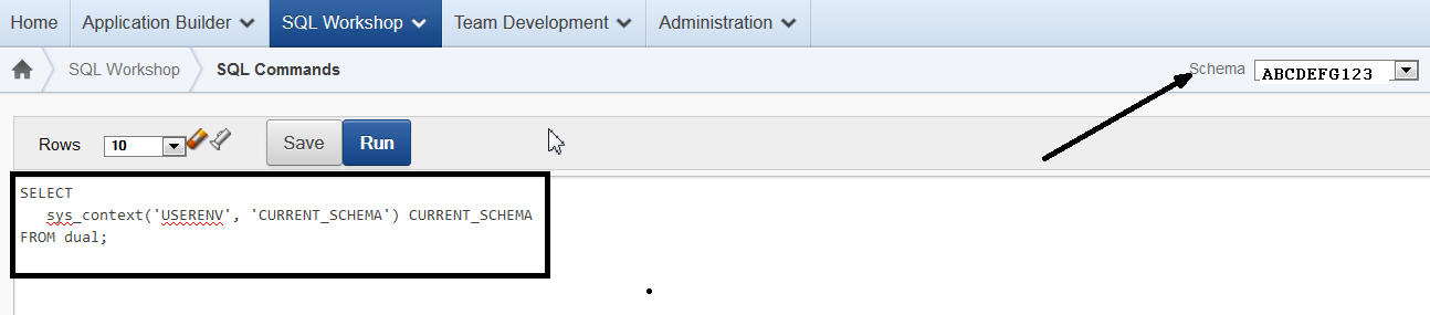 The schema name is visible from Oracle Apex SQL Workshop (in the Schema drop-down – top right).