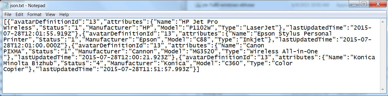 [{“avatarDefinitionId”:”13″,”attributes”:{“Name”:”HP Jet Pro Wireless”,”Status”:”1″,”Manufacturer”:”HP”,”Model”:”P1102W”,”Type”:”LaserJet”},”lastUpdatedTime”:”2015-07-28T12:01:55.919Z”},{“avatarDefinitionId”:”13″,”attributes”:{“Name”:”Epson Stylus Personal Printer”,”Status”:”1″,”Manufacturer”:”Epson”,”Model”:”C88″,”Type”:”Inkjet”},”lastUpdatedTime”:”2015-07-28T12:01:00.000Z”},{“avatarDefinitionId”:”13″,”attributes”:{“Name”:”Canon PIXMA”,”Status”:”1″,”Manufacturer”:”Cannon”,”Model”:”MG3520″,”Type”:”Wireless All-in-One “},”lastUpdatedTime”:”2015-07-28T12:00:21.923Z”},{“avatarDefinitionId”:”13″,”attributes”:{“Name”:”Konica Minolta Bizhub”,”Status”:”4″,”Manufacturer”:”Konica”,”Model”:”C360″,”Type”:”Color Copier”},”lastUpdatedTime”:”2015-07-28T11:51:57.993Z”}]