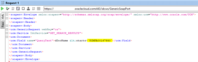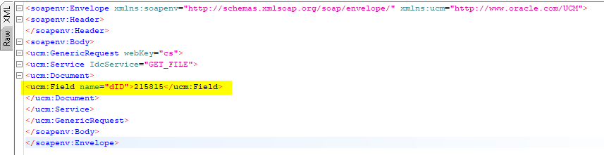 This section outlines how to build the Soap requests that utilizes the public idcws/GenericSoapPort?wsdl (available in Fusion R10+). “GET_SEARCH_RESULTS” is used to retrieve the “dID” based on the “UCM ID” of the CSV file (gathered from Step Two). “GET_FILE” is then used to retrieve the file associated the given “dID”. The file is returned as a SOAP attachment.