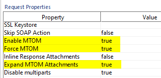 In Request Properties set Enable MTOM, Force MTOM, and Expand MTOM Attachments = true