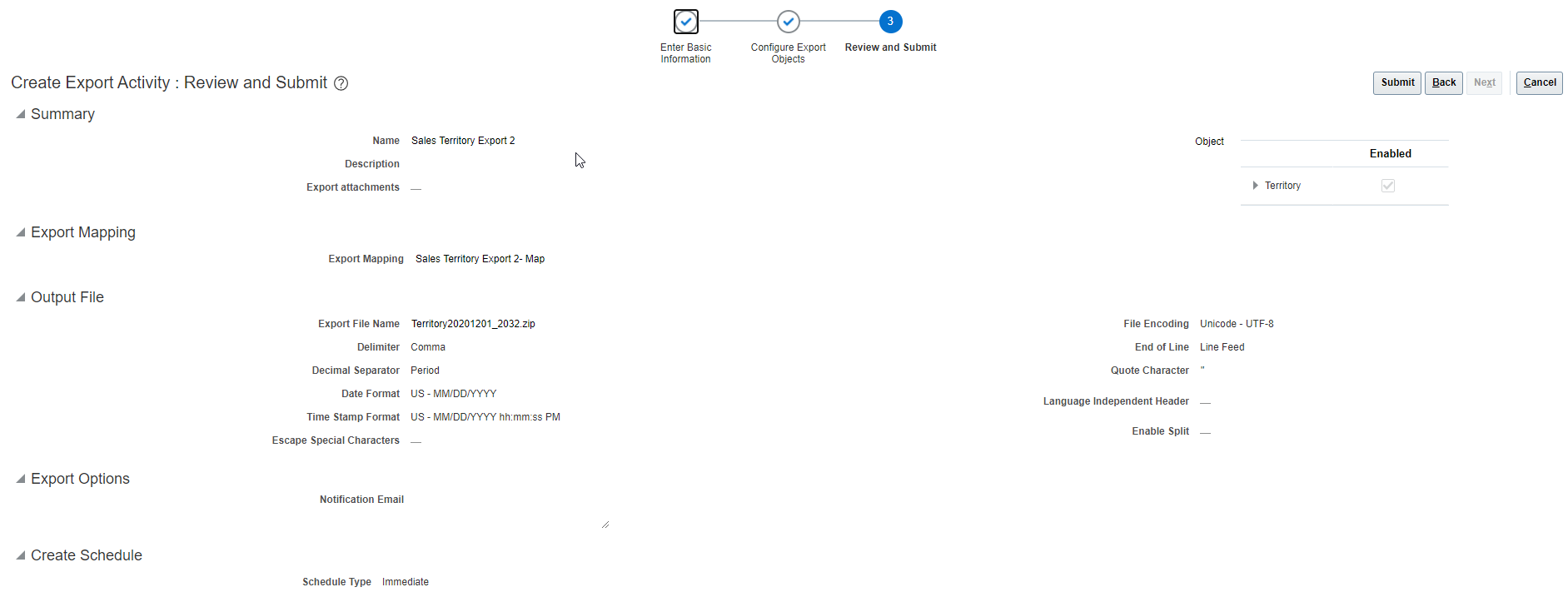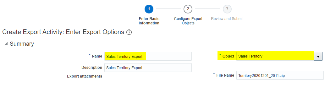 Note: Oracle has discontinued File-Based Data Export support for CX Sales and B2B Service objects with the 20D Update. If you need help transitioning from File-Based Data Export, refer to the document Transition from File-Based Data Import to Import and Export Management (Document ID 2576983.1) on MOS.