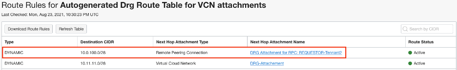 Once the peering relationship is done, you can go to either DRG, click DRG Route Tables, click “Autogenerated Drg Route Table for VCN attachments” and click on “Get All Route Rules” you should see routes from the other tenancy.