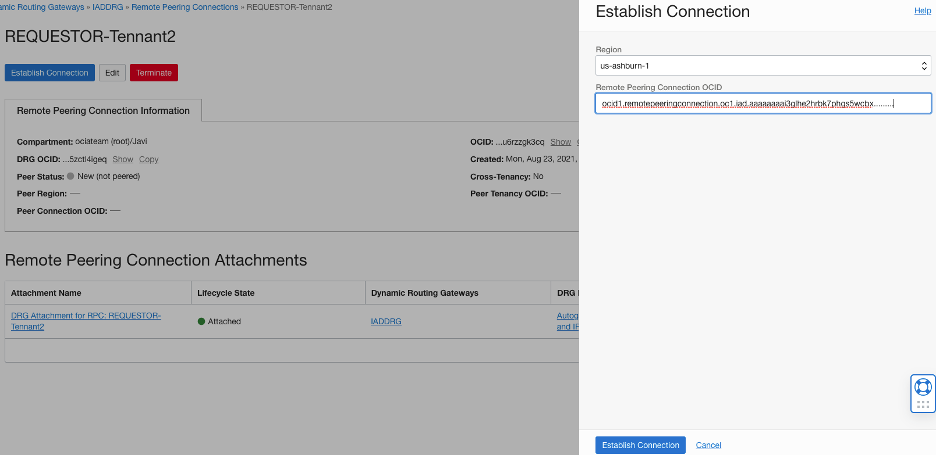 From the Requestor console, click the RPC “REQUESTOR-Tennant2” link, click the Establish Connection button and enter the region for the RPC you are trying to establish connectivity to and the OCID for the remote RPC (ACCEPTOR-Tennant1), click Establish Connection