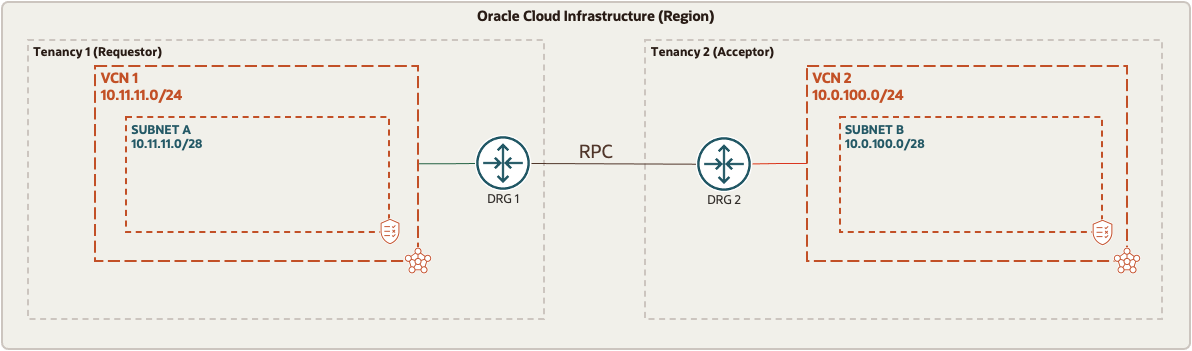 For the purpose of this blog we will use the diagram below where we have two tenancies in the same region. The same process applies if the tenancies are in different regions. Each tenancy has its own VCN, with a subnet, and its own DRG.