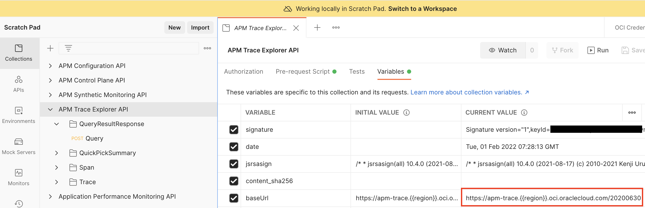 Each collection has baseUrl variable defined which sets the endpoint for each collection, for example the Trace Explorer API collection has endpoint as https://apm-trace.{{region}}.oci.oraclecloud.com/20200630 where region variable gets value from “OCI Credentials” environment as shown in below screenshot.
