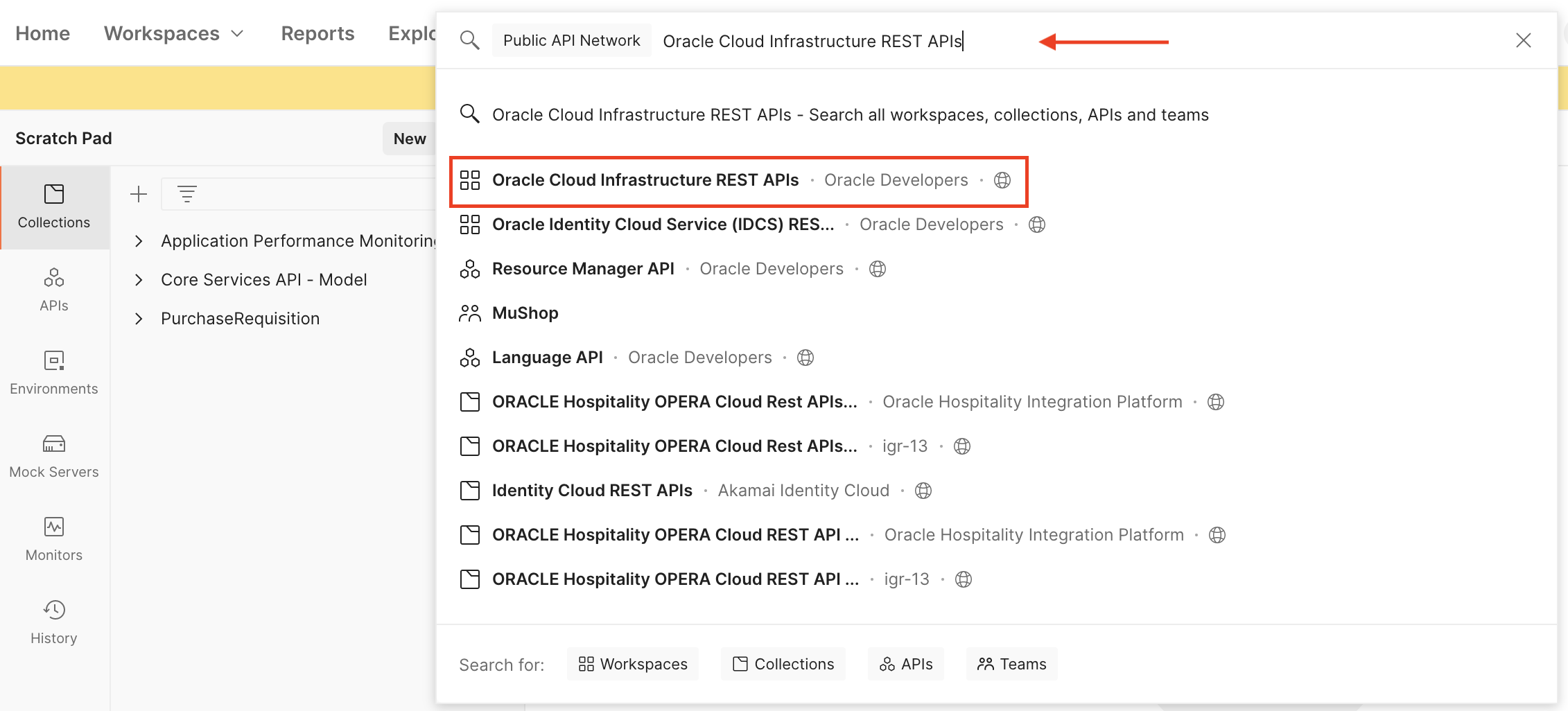 Oracle Cloud Infrastructure REST APIs workspace: It has various collections of OCI Rest APIs.