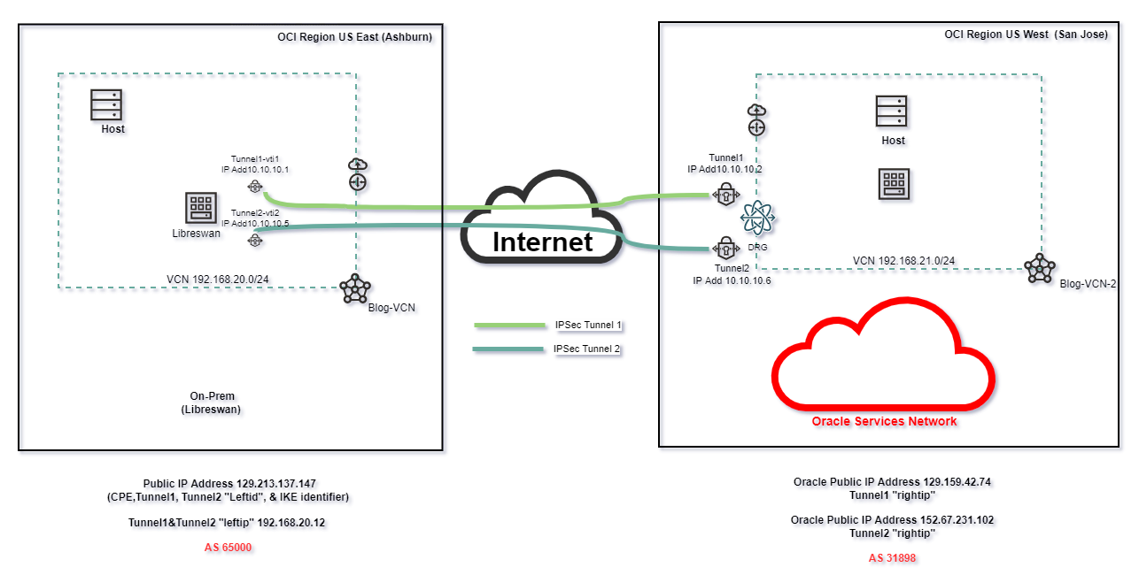 1. Two VCNs in two different OCI regions ( I’ve chosen Ashburn for illustrated on-prem and San Jose for OCI side)