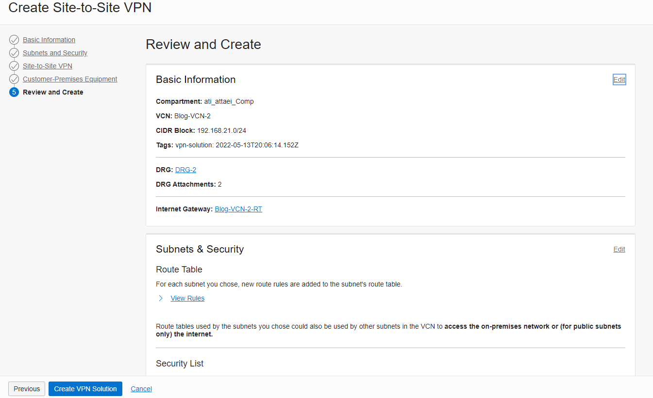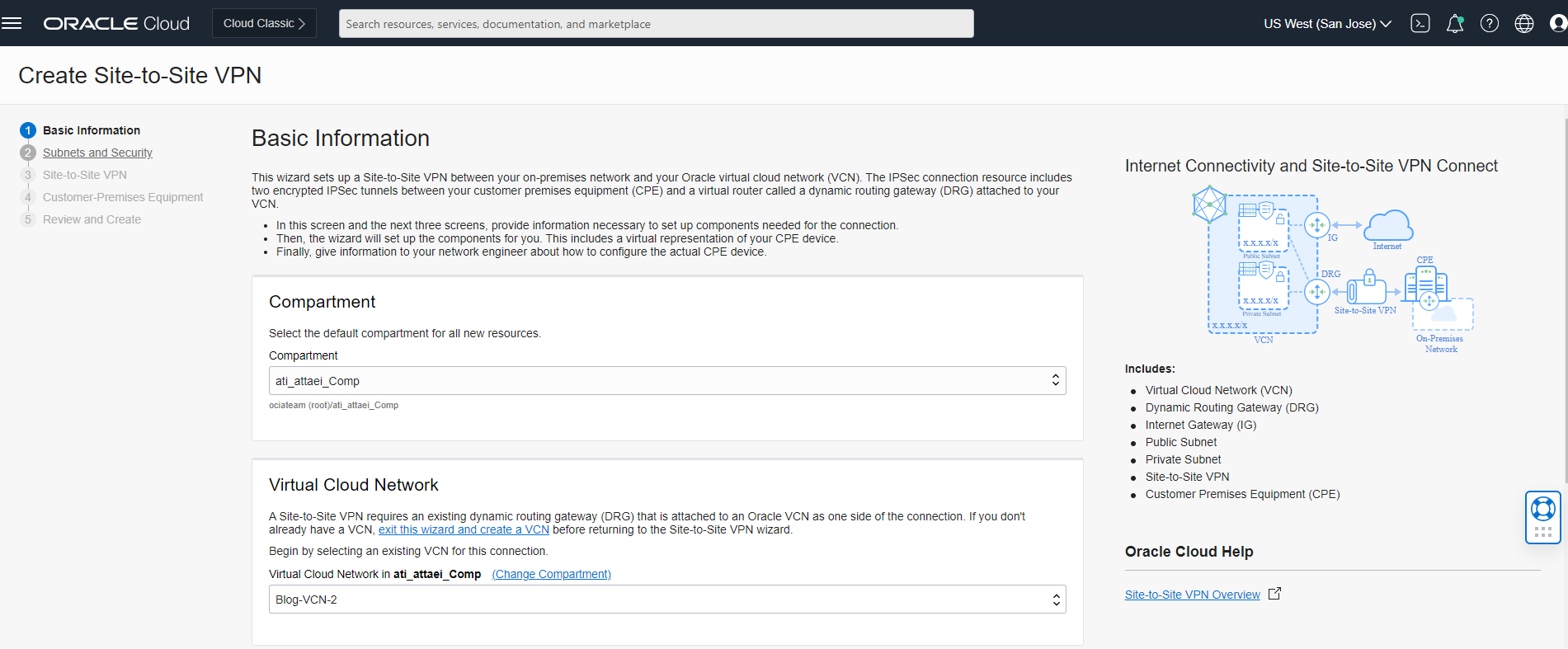 - In the Basic Information tab, select your compartment, VCN, DRG, and IGW, and click “Next”.
