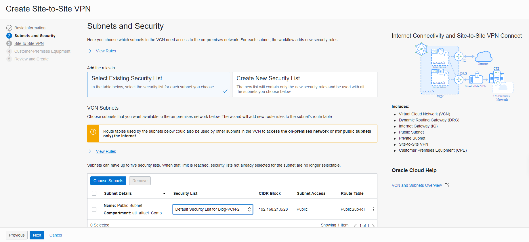 - In the Subnet and Security tab, select the existing Security list or create a new one and click “Next”.