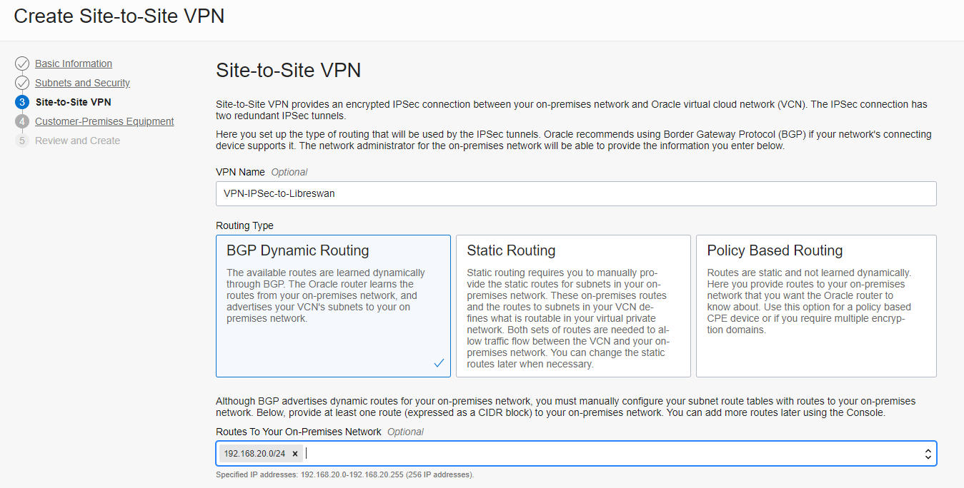 - In the site-to-Site tab, enter the VPN’s name (VPN-IPSec-to-Libreswan), select the “BGP Dynamic Routing” as a routing type, and enter the route pointing to your on-premises network that here is represented by the network behind the Libreswan tool (192.168.20.0/24)