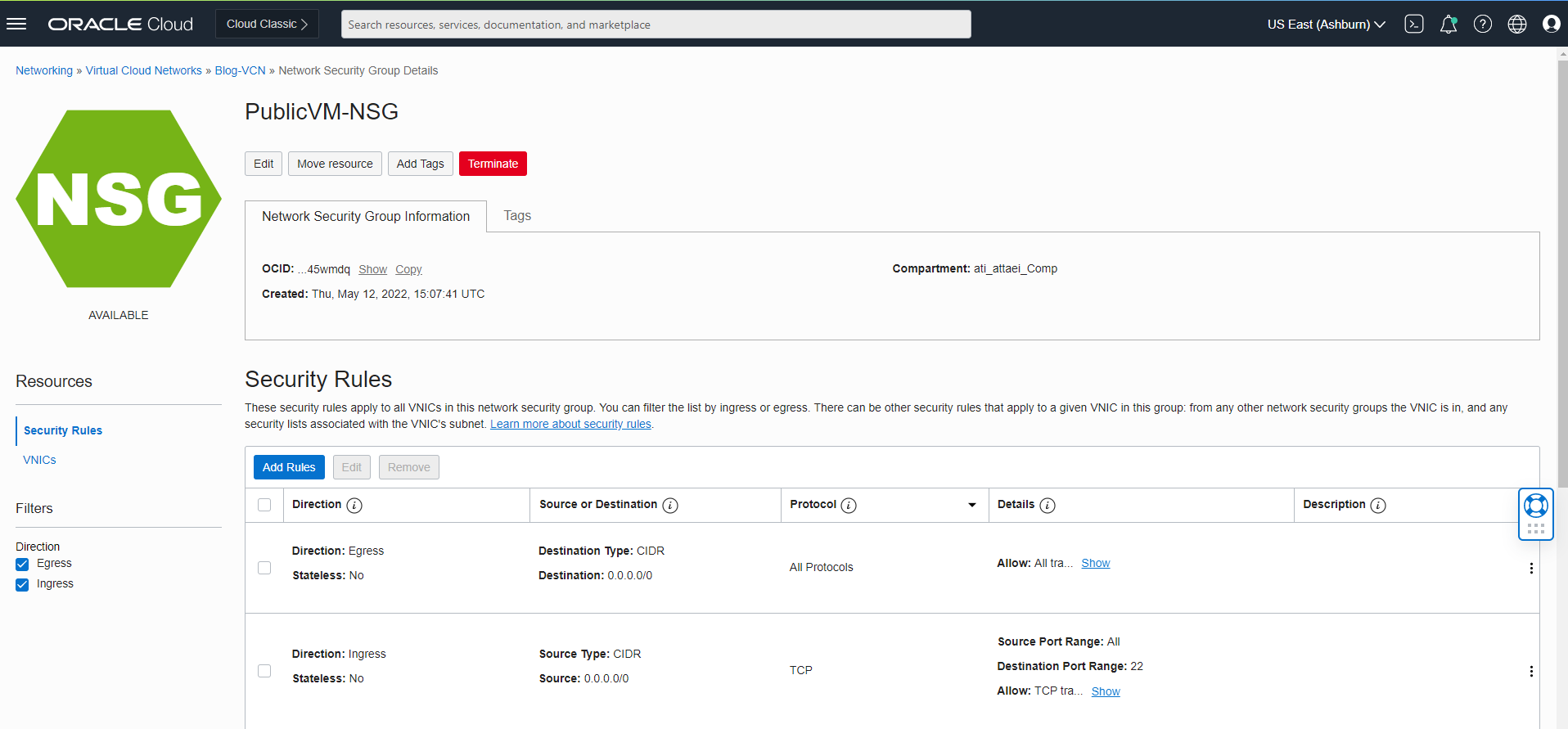 3. SSH inbound rule needs to be removed from the VCNs’ security list and added under the NSG to allow the SSH connection from outside to the VM machine.