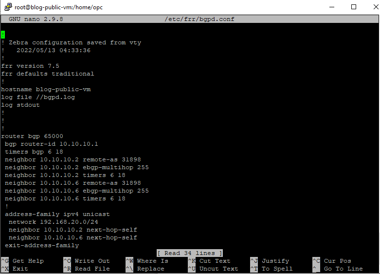 “sudo nano /etc/frr/bgpd.conf” and write down your bgp config there