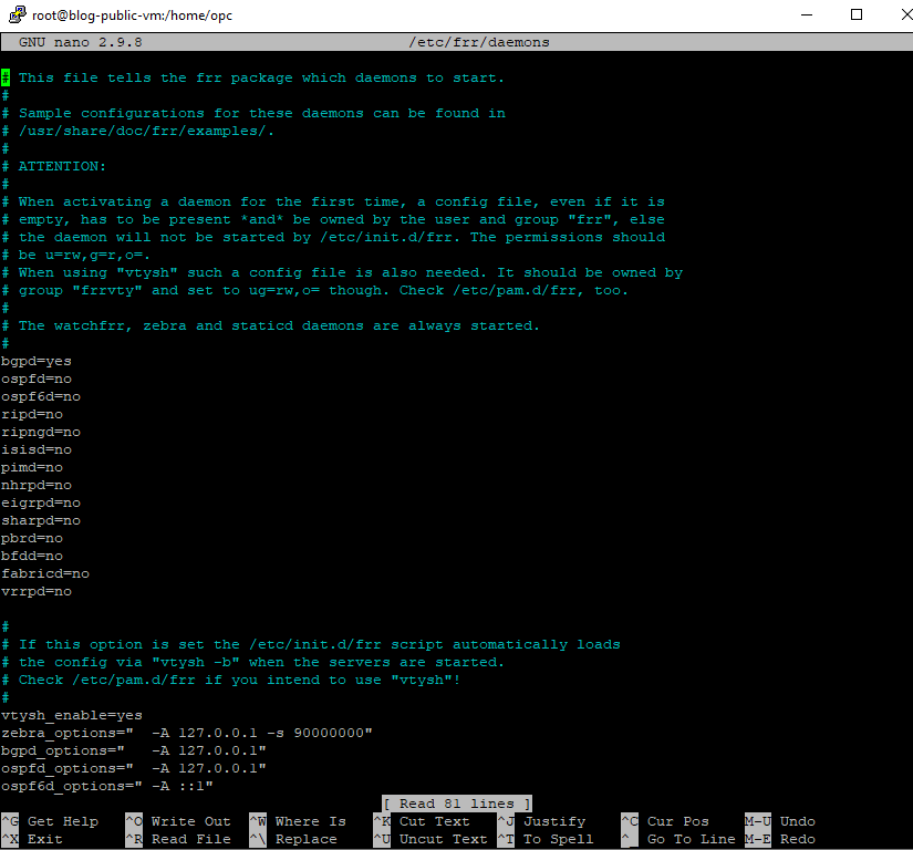 - To enable any daemons in FRR (in our case BGP ), before we start the FRR routing, we need to edit the daemons file by the command below