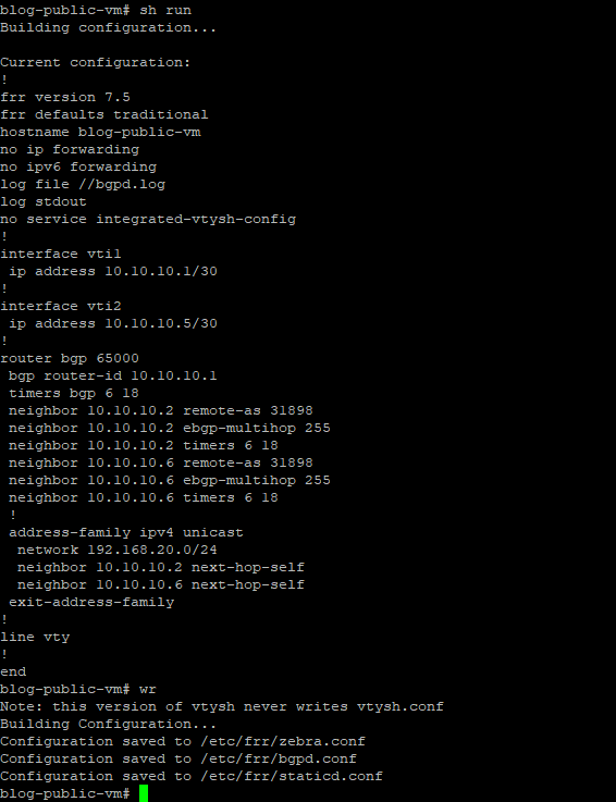 As you noticed, IPSec tunnels are up; let’s move on to the next step and install FRR to run BGP: