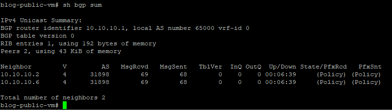 And run the vtysh command to check out the BGP neighbors and the configurations details up to this point: